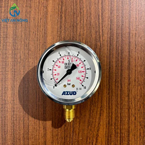 Sản phẩm được sản xuất bởi AZUD – Tây Ban Nha, thương hiệu nổi tiếng về thiết bị tưới và đo lường áp suất, giúp người dùng kiểm soát áp lực vận hành an toàn và hiệu quả.